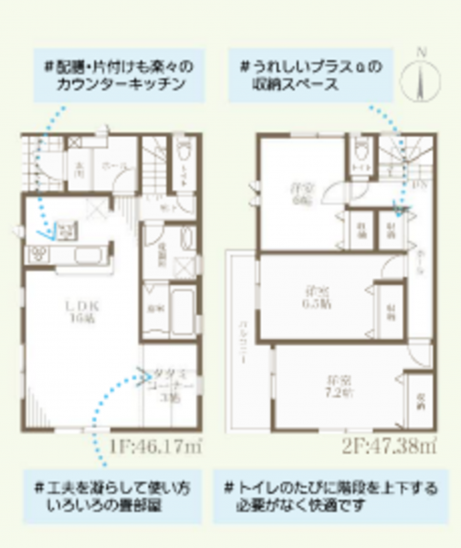 - カウンターキッチン、シャンプードレッサー、洗浄便座、浴室乾燥機、モニタ付インターホン、駐車場2台分、床下収納、トイレ2箇所